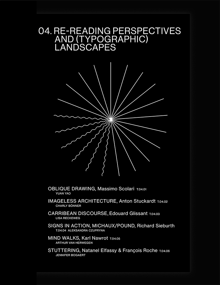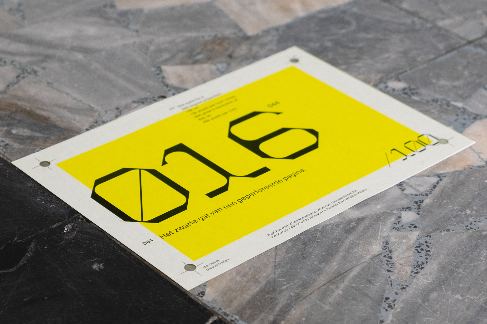 Starting from 001 list of 100 items that represents the recent history of the programme, 023 students multiplied this into 004 lists, 001 audio recording, 008 projectors together creating 001 large projection, 2k4 minutes of film, 010 light boxes and 100 different handouts printed on 1k4 sheets of paper normally worn by runners. However, during its setup, the exhibition was already closed (corona). No exhibition, no public. The handouts are to be bound in 014 catalogues.