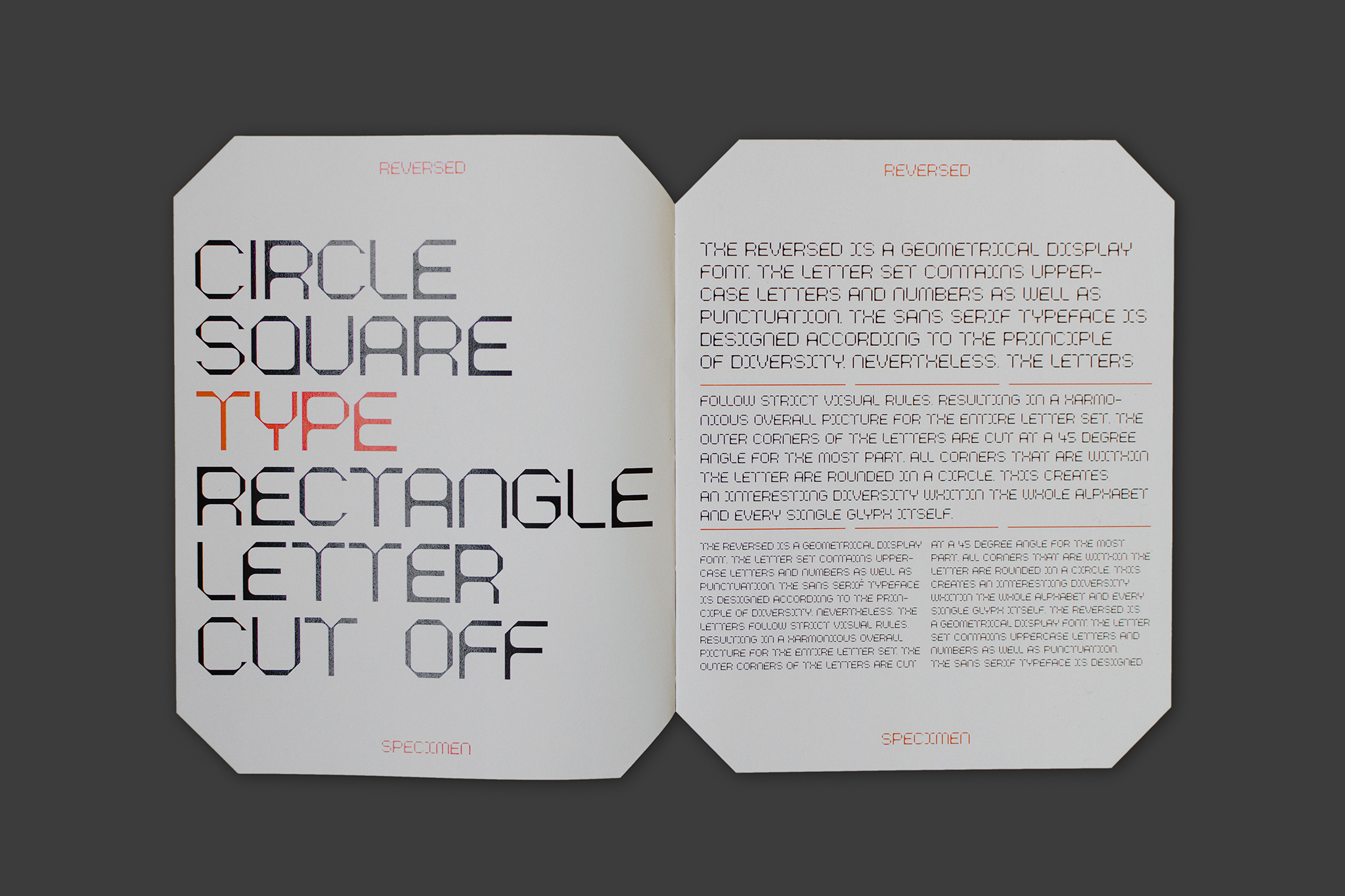 The Reversed is a geometrical Display Font. The letter set contains uppercase letters and numbers as well as punctuation. The sans serif typeface is designed according to the principle of diversity. Nevertheless, the letters follow strict visual rules, resulting in a harmonious overall picture for the entire letter set.